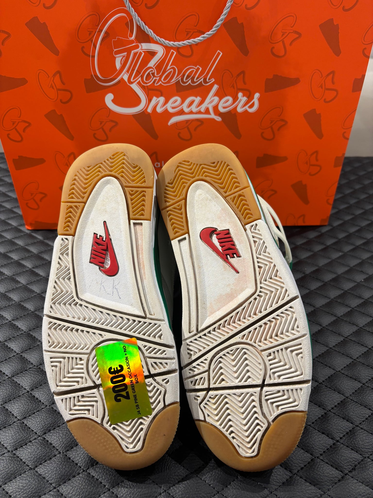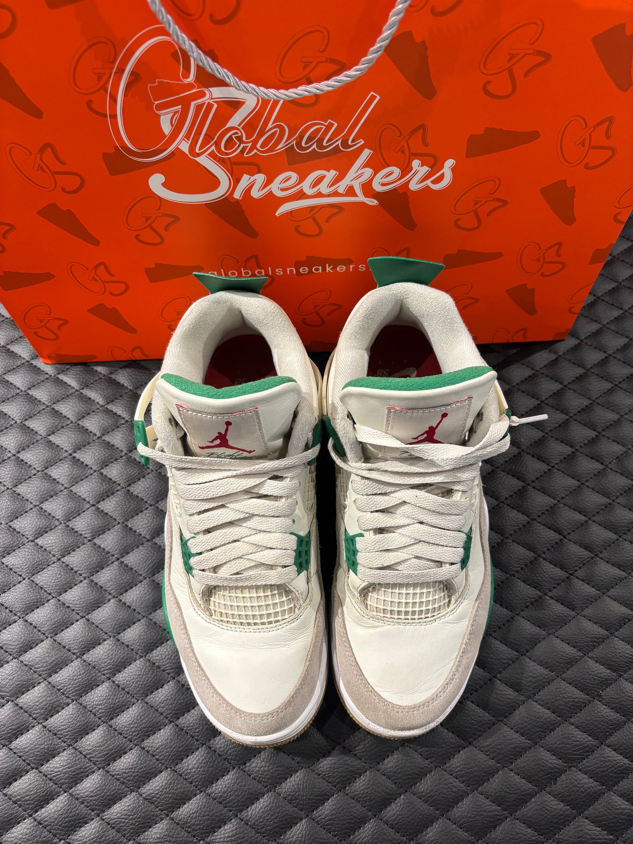 Cette Air Jordan 4 SB Retro en coloris vert sapin, présentée en état 8/10, réunit l’héritage basketball de la Jordan 4 et l’exigence technique du skate pour offrir une silhouette puissante et modernisée. La construction met en valeur un mélange harmonieux de suede premium, de renforts structurés et de détails revisités pour améliorer la stabilité et la souplesse, tout en préservant les lignes mythiques du modèle original. Le vert pin apporte une profondeur élégante qui sublime la matière et renforce la présence graphique de la sneaker, tandis que l’usure reste légère avec quelques marques discrètes, une forme parfaitement maintenue et une semelle propre, témoignant d’un entretien soigné malgré l’absence de boîte. Authentifiée et minutieusement préparée, cette paire capture l’essence du style hybride entre performance technique et culture street, faisant de cette version SB un incontournable recherché par les connaisseurs.