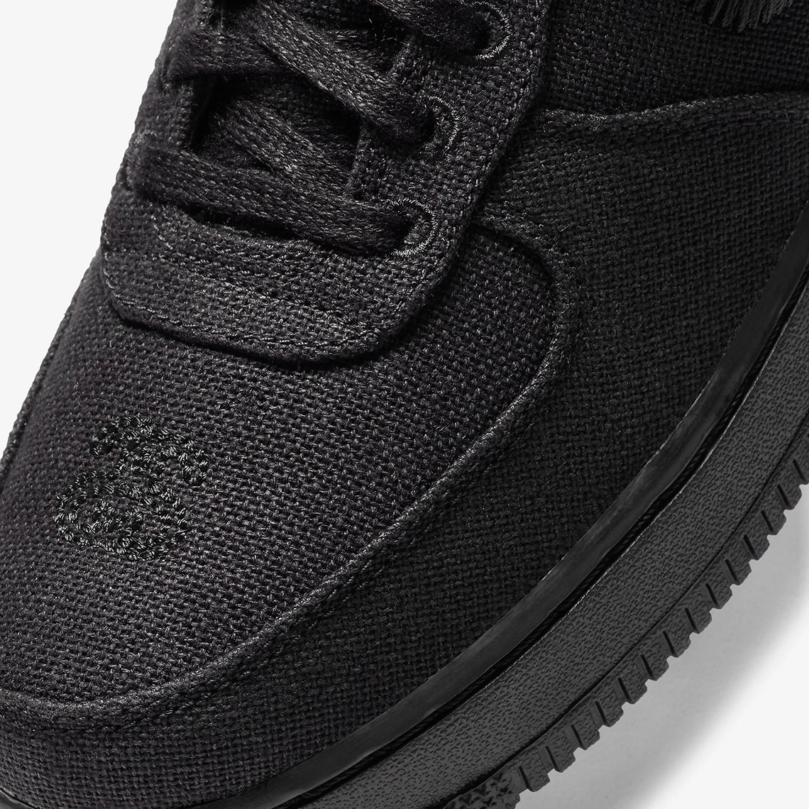 Les détails signature Stüssy donnent toute son identité au modèle : le double “S” perforé sur la toebox, le logo brodé au talon, et les patchs Stüssy subtilement intégrés sur la languette. Le swoosh ton-sur-ton se fond parfaitement dans la toile noire, créant un look minimaliste, premium et très contemporain.